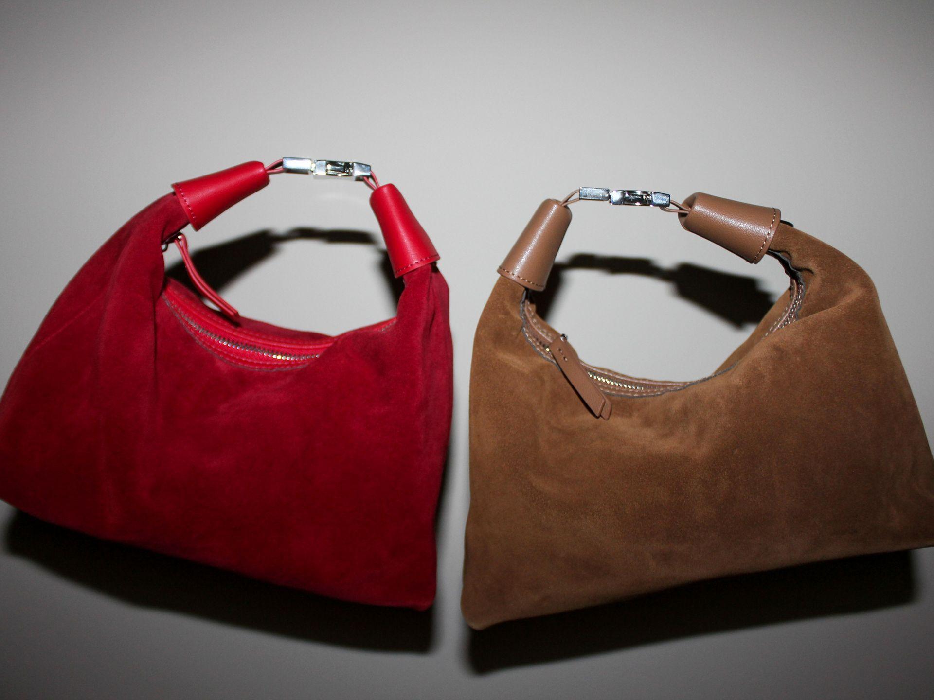 Bolso de mano pequeño en piel gamuza genuina con cierre de cremallera, herrajes plateados, y correa adicional para llevar como cruzado